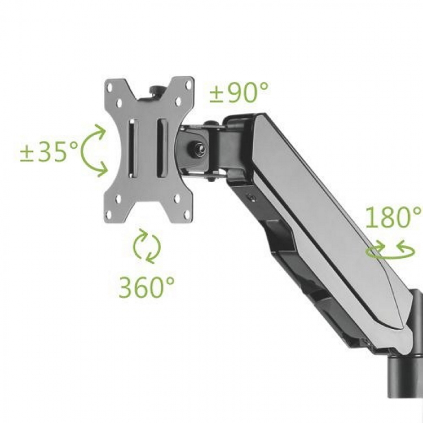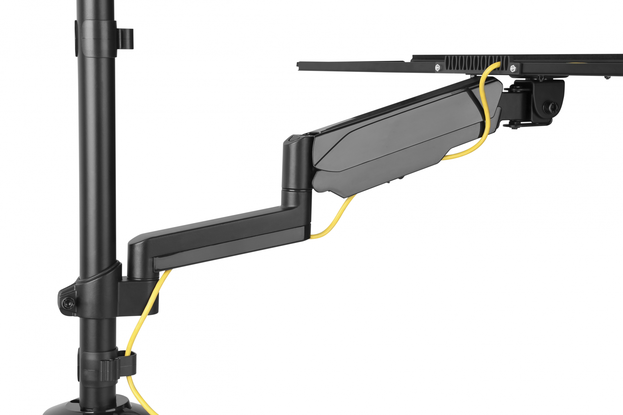 Een volledig verstelbare bureausteun voor monitor toetsenbord en muis een optimale ergonomische zit sta werkplek aan uw bureau. Geschikt voor beeldschermen van 17 inch tot 32 inch met een maximaal gewicht van 9 kilo. Deze verstelbare ergonomische beugel voor uw monitor toetsenbord en muis biedt optimaal comfort bewegingsvrijheid en productiviteit. Het instellen van de gewenste werkhouding is eenvoudig met het full-motion gasveer mechanisme bereikt u de meest geoptimaliseerde kijkpositie. Het beeldscherm is draaibaar + 90 graden en – 90 graden kantelbaar 35 graden naar boven en 35 graden naar onder en rotateerbaar 180 graden voor portrait of landscape. Tevens is de arm in hoogte verstelbaar van 22 cm tot 75 cm. De diepte kan ingesteld worden tussen 0-56 cm. De toetsenbordlade is geüpgraded om uw pols meer comfort te bieden. Kabelbeheer houdt uw bureau schoon en georganiseerd. Vesa compatibel met 75×75 en 100×100,